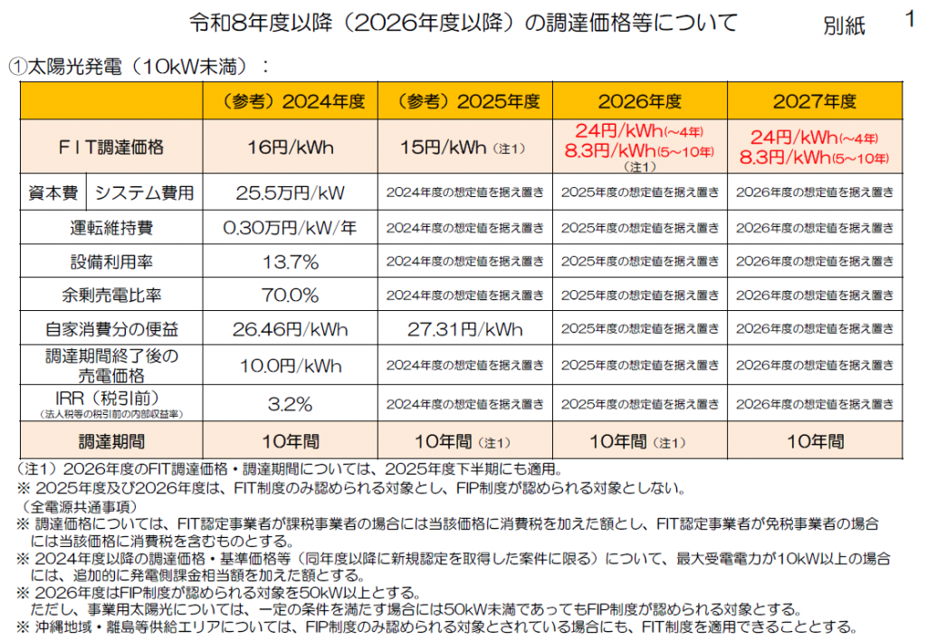 ・住宅用太陽光発電:2026年度から変更なし 24円/kWh1(〜4年)、8.3円/kWh11(5〜10年)