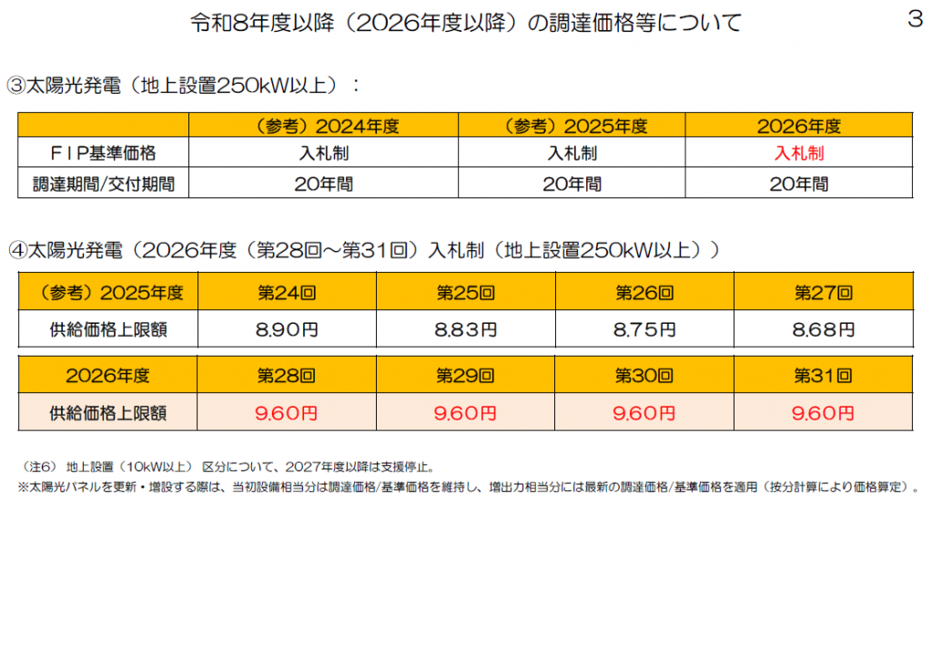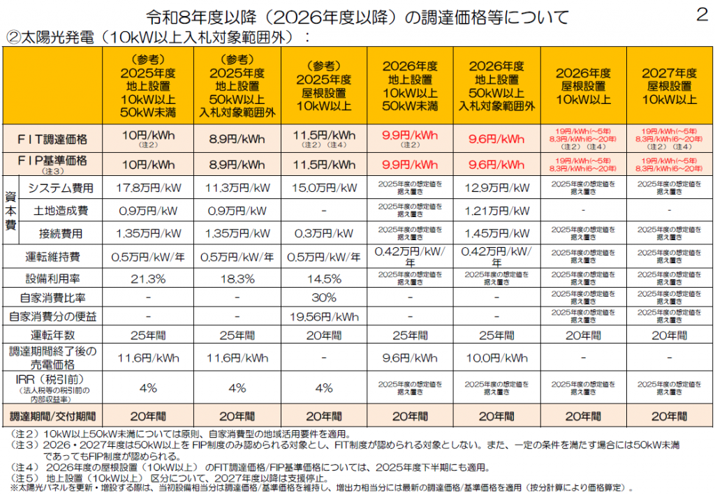 ・事業用太陽光発電・屋根設置・10kW以上:2026年度から変更なし 19円/kWh1(〜5年)、8.3円/kWh11(6〜20年)